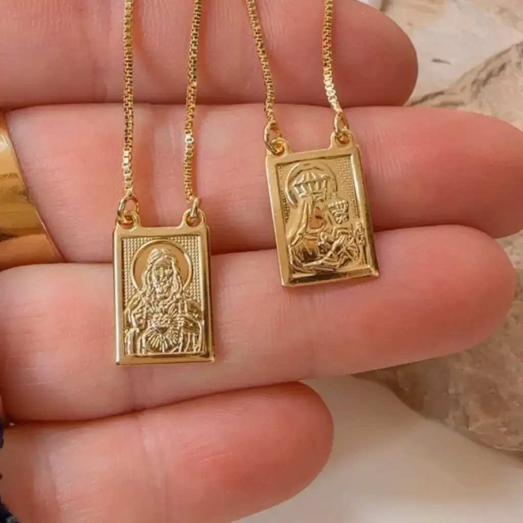 Nossas semijoias são cuidadosamente projetadas para serem hipoalergênicas, banhadas em Ouro 18K e revestidas com uma camada de verniz especial, garantindo um acabamento brilhante e duradouro. Perfeitas para peles sensíveis, nossas peças são fabricadas com precisão e qualidade, resistindo ao tempo e proporcionando um visual sofisticado e atemporal. Confeccionado em corrente veneziana, este escapulário é uma peça versátil que pode ser usada por homens e mulheres.